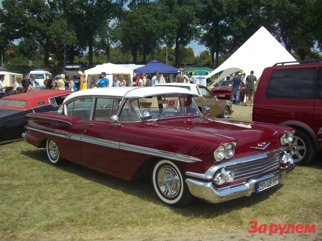 Казалось бы, в стране, официально признанной родиной автомобиля, на заокеанское железо должны смотреть в лучшем случае снисходительно. Но нет: American Way of Life, воплощенный в сотнях лошадиных сил и упакованный в сверкающие многометровые кузова, находит весьма многочисленных поклонников. Дрезденская конвенция, например, год назад собрала 470 единиц техники – не только легковых машин, но также автобусов, вэнов, мотоциклов – и привлекла на территорию местной ярмарки более 6000 зрителей. 150 машин приняли участие в парадном проезде по Дрездену, завершившем трехдневный фестиваль. Надо думать, цифры 2013-го будут не хуже. Я приехал на шоу к полудню, а участники (и зрители, разумеется) все прибывали.