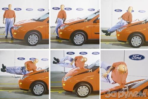 Совсем недавно мы писали (ЗР, 2002, № 2), как собираются защитить пешеходов от автомобиля; тем временем сделано еще несколько шагов по пути прогресса. Комплексную систему, включающую измененные бампер, фары и капот, встроили в серийный " Форд Фокус" и успели испытать на манекене. Результаты обнадеживают.