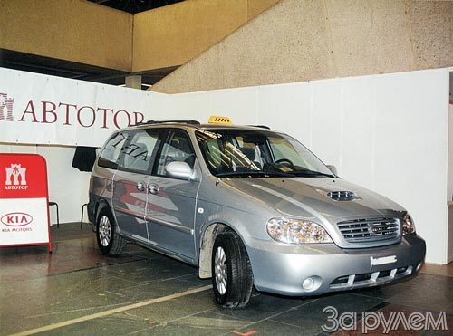 Калининградский "Автотор" представил на выставке "Пассажир-2003" " КИА Карнавал" в варианте такси. Изготовлено оно по заказу правительства Москвы. Под капотом - 2,9-литровый турбодизель (106 кВт/144 л. с.), который потребляет в городе чуть больше 11 л/100 км. В задней части салона - удобные кресла для пассажиров, около сдвижных дверей - еще пара откидных. Рабочее место водителя - за прозрачным пластиковым щитом, а на панели приборов счетчик с кассовым аппаратом. Ориентировочная цена таксомотора - 16 000 долл.