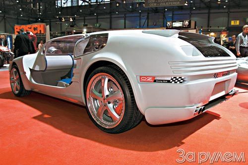 Кроме мотоцикла, фирма показала автомобиль "Челлендж" (вызов), выполненный по такой же схеме. Здесь, правда, трехлитровый двигатель V6 мощностью 221 кВт/300 л. с. выступает из 22-дюймового колесного диска, да и глушитель пришлось разместить в заднем мосту, но... Экономия снаряженной массы составила, по оценкам разработчиков, 30-40% и, самое главное, оказалось возможным снабдить четырехместный автомобиль спортивного покроя двумя багажниками по кубометру каждый.