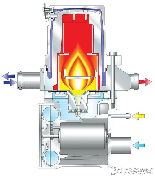 Воздух в горелке разгоняется до скорости примерно 50 м/с. В результате достигают лучшего распыления топлива и его мгновенного воспламенения на свече накаливания. Кроме того, керамика имеет значительно меньшую теплопроводность и большую теплостойкость, чем металл. Поэтому она быстро разогревается до температур, обеспечивающих полное испарение поступающего топлива, - в результате выход на полную тепловую мощность занимает всего 60 с.