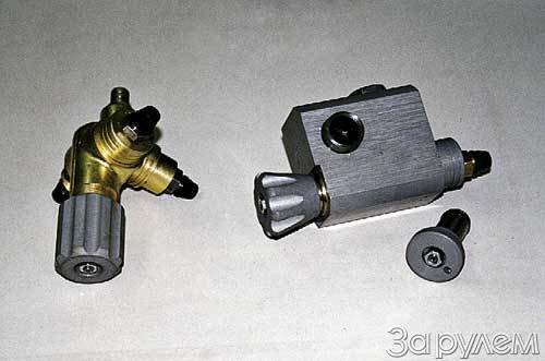 Баллон, пожалуй, самая дорогая деталь. Чтобы снизить массу и повысить прочность стенок, применяют легированные металлы или алюминий, армированный стеклопластиком. Каждый литр внутреннего объема стоит примерно 4-5 долларов. Нетрудно прикинуть цену 50-литрового бочонка для "Жигулей". Грузовички вроде "Газели" довольствуются стальными баллонами с толстенными стенками - они дешевле, но весят бог знает сколько. Тем, кто ежедневно накручивает по несколько сотен километров, поставят два баллона - тяжеловато, зато за указателем топлива не надо постоянно следить.