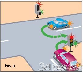 И еще одна конфликтная ситуация, которую, сами того не подозревая, устраивают дорожные службы, устанавливая порядок движения, заведомо противоречащий ПДД. На рис. 3 представлена довольно типичная ситуация, когда, строго говоря, преимущества нет ни у одного из водителей. Оба следуют в направлении стрелки, включенной в дополнительной секции светофора, а значит, в соответствии с пунктом 13.5 Правил должны уступить дорогу транспортным средствам, движущимся с других направлений (то есть друг другу). Советуем и здесь руководствоваться общим принципом проезда перекрестков: движение могут начинать два автомобиля одновременно, однако в завершающей стадии маневра водитель, выполняющий разворот, должен уступить дорогу тому, кто поворачивает - в тот момент он окажется справа.