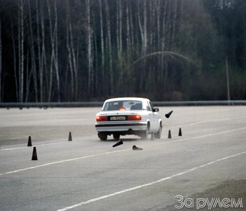 Но начнем все-таки от "печки" - то бишь от машины со старой, стандартной подвеской. Объезд препятствия, по-испытательному "переставка", для обычной "Волги" - мучение, видно невооруженным глазом. Глубокие крены, резкий срыв задней оси... Добавить пару километров в час - и автомобиль, сбивая многострадальные конусы, станет фактически неуправляемым.