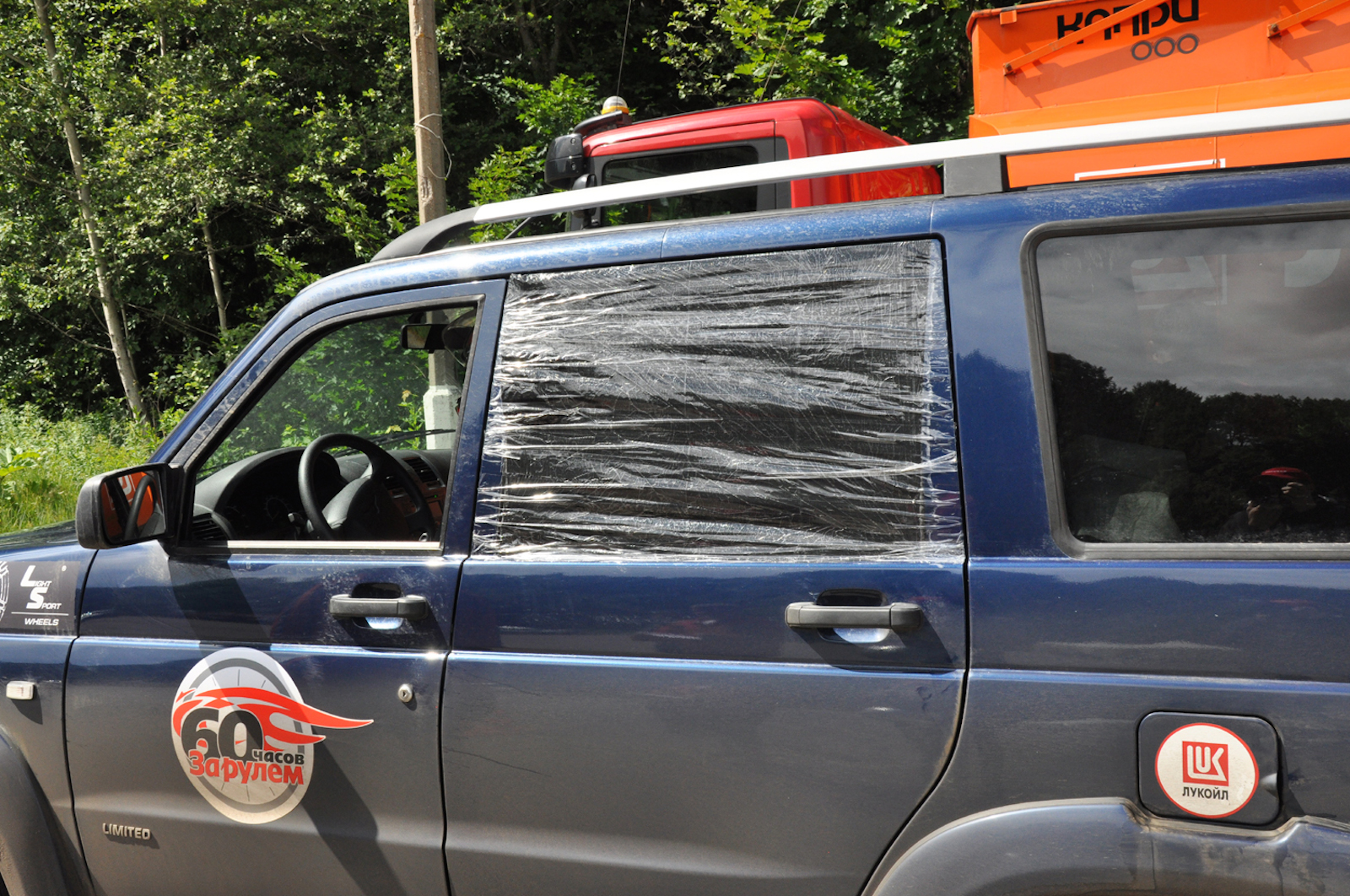 Наконец, моя бригада пересела на UAZ. Ну что сказать: думал, будет хуже, и сначала было даже страшно. Но все страхи оказались преувеличенными. В смене я еду третьим, и с утра, только прибыв на базу, услышал новость: у Patriot больше нет заднего левого стекла! Дело в том, что поскольку едет он медленнее всех, остальные участники вынуждены его обгонять. Вот так, при обгоне, камень, вылетевший из-под колес Terrano, разбил стекло ульяновского вседорожника. Брешь залатали пленкой и заклеили скотчем.