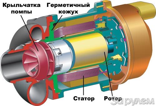 Еще одна особенность нового агрегата: ротор вместе с крыльчаткой заключен в герметичный тонкостенный кожух, не препятствующий магнитному полю, создаваемому статором. Это несколько уменьшило КПД, зато позволило избавиться от уплотняющих манжет. Нет и коллектора, бесконтактный датчик определяет положение ротора и через контроллер выдает сигнал на обмотки статора. В общем, изнашиваться в новом насосе практически нечему.