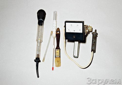 В чем же заключается этот легкий флирт? Тому, кто его затевает, нужен минимальный "джентльменский набор" - ареометр и термометр для измерения плотности и температуры электролита, нагрузочная вилка - для определения состояния батареи, зарядное устройство, кисточка для мойки и раствор питьевой соды - для нейтрализации случайно пролитого электролита. Остальное - пластиковые воронка и емкость, автомобильная лампочка на 45 Вт, пара ключей да кусок провода - есть, наверное, у каждого.