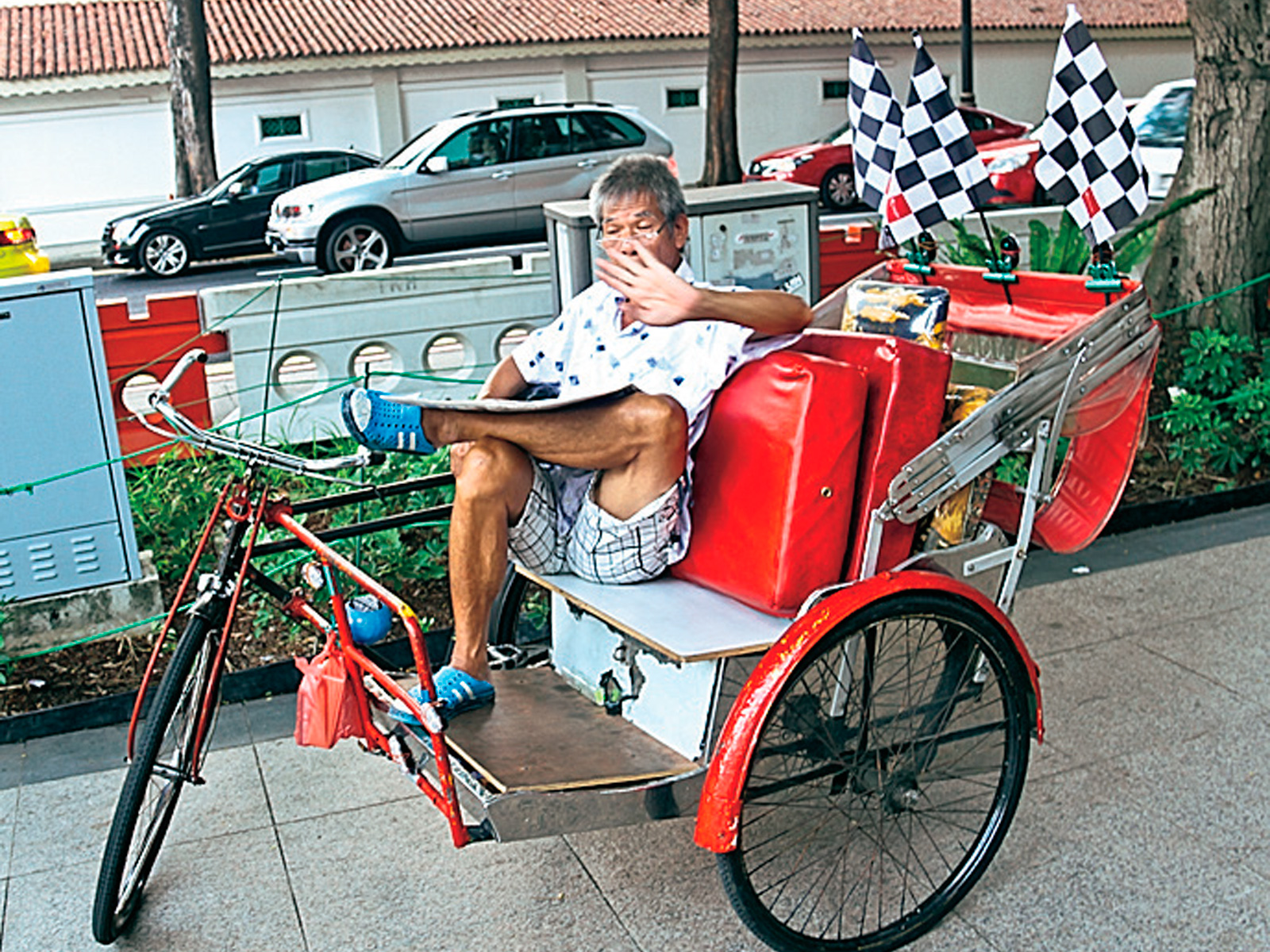 Подобного гоночного безумия я не видел ни в одном из городов мира, принимавших Гран-при. Количество клетчатых флагов на улицах зашкаливает, силуэты болидов встречаются во множестве, к месту и не к месту. В бутике «Феррари» счетчик времени ведет обратный отсчет до начала гонки. В отеле «Пан Пасифик» (он находится совсем рядом с трассой, всего в паре метров от ограждения) весь персонал по случаю этапа одели в полугоночную униформу, у девушек на ресепшене даже маникюр был в черно-белую клеточку.