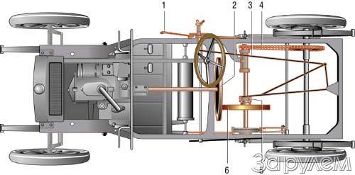 Схема автомобиля "Тюрикум": 1 - рычаг управления трансмиссией; 2 - ведущий диск; 3 - тяга управления ведомым роликом; 4 - цепь; 5 - муфта; 6 - ведомый ролик трения.
