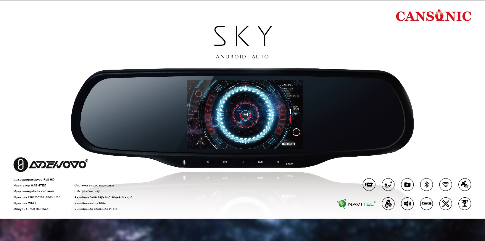 Компания характеризует CANSONIC SKY так: «умная автомобильная система категории AndroidAuto в форме зеркала заднего вида». Как правило, гибридные автомобильные гаджеты непременно означают серьезный компромисс хотя бы одной из основных функций. В CANSONIC SKY – ничего подобного, аппарат с успехом совмещает в одном корпусе: Full HD регистратор (с двумя камерами), 5-дюймовый Android-планшет, автомобильный мультимедийный центр с поддержкой Hands Free и Wi-Fi, навигатор и даже систему видеопарковки.