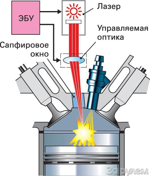 Одна из проблем бензиновых двигателей с непосредственным впрыском - как поджечь переобедненную смесь. Приходится идти на разные ухищрения, чтобы создать легковоспламеняемую зону около искры. А что если не заряд двигать к свече, а свечу к заряду? Конечно, не саму деталь, а искровой промежуток, а еще вернее - точку, в которой фокусируется мощный лазерный импульс. Итак, нет больше катушки зажигания, нет свечи с выгорающими электродами и нагаром на изоляторе. Есть лазер и сапфировое окошко диаметром около 9 мм в головке блока цилиндров.