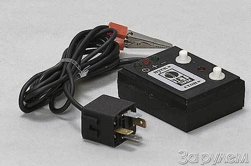 "Помощник", он же - пульт для отладки двигателя автомобиля, представляет собой небольшой корпус с несколькими кнопками и световыми индикаторами, соединенный кабелями с зажимом типа "крокодил" и электромагнитным реле. Пасть "крокодила" цепляем к катушке зажигания, а реле подключаем в разъем штатного реле стартера, предварительно отсоединив его от "насиженного" места. Осталось убедиться, что стояночный тормоз затянут, а рычаг коробки передач находится в "нейтрали".