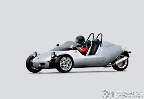По компоновке кузова, выполненного из стеклопластика и усиленного кевларом полиэстера, это типичный двухместный родстер. А вот двигатели и задний привод единственного колеса - от мотоциклов БМВ. Пяти- или шестиступенчатая коробки привычны автомобилисту, но отсутствие в базовой версии... передачи заднего хода живо напоминает о мотоциклетных корнях. Как, впрочем, и непромокаемый "плед" от непогоды. В то же время трапеция рулевого управления, травмобезопасная колонка, баранка, совершающая 2,5 оборота от упора до упора, пришли с четырехколесных БМВ.