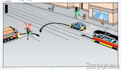 1 - трамвай одновременно с грузовым автомобилем, легковой автомобиль