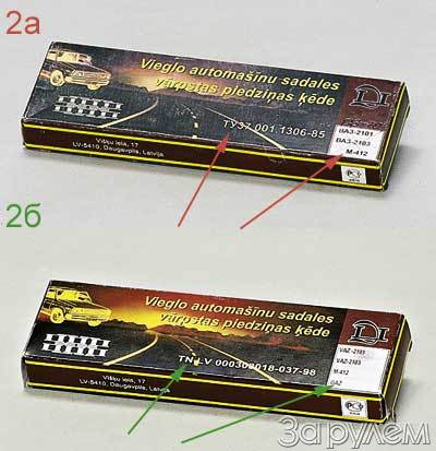 Другой вариант кустарной коробки рисунком больше похож на оригинал (на фото 2а и 2б показана обратная сторона - здесь надписи на латышском языке). Но неправильные номер ТУ и белая табличка выдают подделку. Кстати, на заводской упаковке против индекса соответствующей модели должен стоять специальный значок. На "леваке" его заменяет галка или крючок, поставленные шариковой ручкой. Иногда нет даже их. На нашей же коробочке в "белый список" синими чернилами внесли дополнение: ГАЗ-70... Не ищите такую модель в справочниках - кустари, очевидно, указали число звеньев.