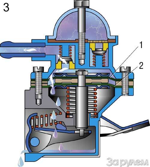 А бывает, охлаждение в порядке, а масла опять-таки "стало больше"... Только попахивает оно бензином. Ищите, каким образом горючее попало в картер! Чаще всего - через прохудившиеся диафрагмы бензонасоса (рис. 3). Косвенный признак - черный дым выхлопа, а то и неровная, с пропусками работа двигателя по причине переобогащения рабочей смеси бензином: "лишние" его пары через систему вентиляции засасываются в карбюратор.