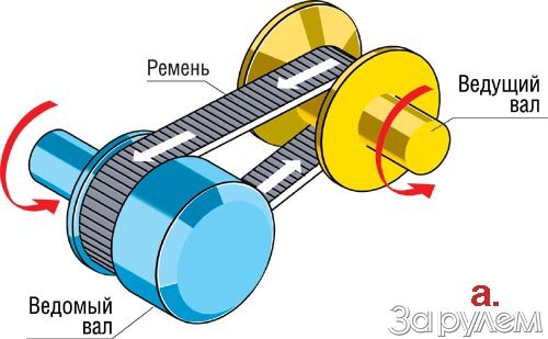 Схема работы клиноременного вариатора: а - максимальное передаточное отношение (на низкой скорости);