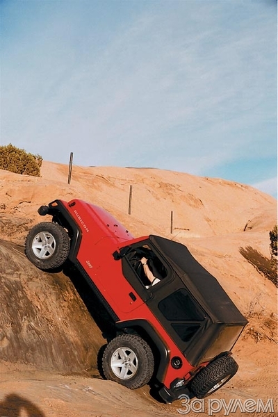Клиренс увеличился на 13 мм благодаря специально разработанным шинам большого диаметра с зубастым протектором, заходящим на усиленные боковины. Литые диски сделаны с вогнутыми вовнутрь спицами, чтобы максимально защитить их от повреждения камнями. Мощность 4-литровой "шестерки" и возможности стандартной "пятиступки" разработчики сочли вполне достойными версии "Рубикон". А вот раздаточную коробку спроектировали заново - "Rock-Trac" с цепным (!) приводом переднего моста получила передаточное отношение 4,10 вместо 2,72. В сочетании с новыми блокируемыми дифференциалами Tru-Lok спереди и сзади (а межосевого у "Рэнглера" и вовсе нет) это делает автомобиль поистине неудержимым, пусть медленно, но верно ползущим к цели. Блокировки включаются кнопкой на панели приборов, причем умная автоматика наложит вето при скорости выше 16 км/ч.