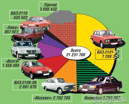 Следующее место в рейтинге популярности занимает вазовское "восьмое" семейство - 2,1 млн., потом идут "волги" всех моделей (1,5 млн.), некогда служившие символом благосостояния. Неожиданно много оказалось среди российских автолюбителей владельцев разных "запорожцев" и "таврий" - 1,3 млн. Правда, "горбатые" и "ушастые" "запоры" фигурируют сегодня скорее как герои анекдотов, а не средство передвижения - гниют себе тихо и портят общую картину парка.