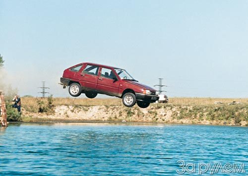 Карьер этот когда-то снабжал глиной небольшой кирпичный заводик. Завода давно уже нет, а на месте карьера образовалось болотистое озерцо. Обрывистые берега, достаточная глубина - лучшего места для второй части эксперимента не сыскать. По нашим расчетам, машина, движущаяся со скоростью 60 км/ч, вылетая с полутораметрового парапета с небольшим, около пяти градусов, трамплинчиком, ударится о воду со скоростью около 17,5 м/с. При этом на ветровое стекло, даже с учетом его наклона, будут давить несколько тонн воды. Стекло, конечно же, не выдержит, провалится в салон и обрушится на водителя. Чтобы его обезопасить, ставим под стекло между "торпедо" и крышей широкую доску и фиксируем ее распоркой под заднее сиденье. Рядом с рычагом коробки передач закрепляем острый нож (перерезать ремень, если вдруг откажет его замок) и молоток (разбить окно двери, если ее заклинит или сломается стеклоподъемник). Вот и все, что мы позволили себе в части доработки автомобиля. Согласитесь, не так уж много, чтобы эксперимент нельзя было считать чистым.