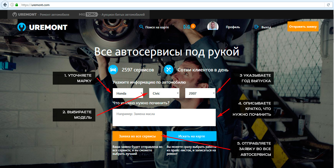 Как он работает: вы примерно за минуту оформляете заявку (выбираете марку, модель, год выпуска авто и в двух словах описываете, что вам надо сделать). По нажатию кнопки «отправить» ваша заявка будет доставлена во все автосервисы (а их на данный момент подключено более 2,5 тысяч), которые специализируются на ремонте автомобилей вашей марки. Буквально сразу начинают поступать предложения от автосервисов с конкретной стоимостью вашего ремонта (вы можете указать предпочтительный способ оповещения: e-mail или смс). Тянуть с ответом и завышать стоимость им невыгодно — конкуренция в данном случае работает на клиента очень эффективно! Остается выбрать то предложение, которое подходит вам больше.