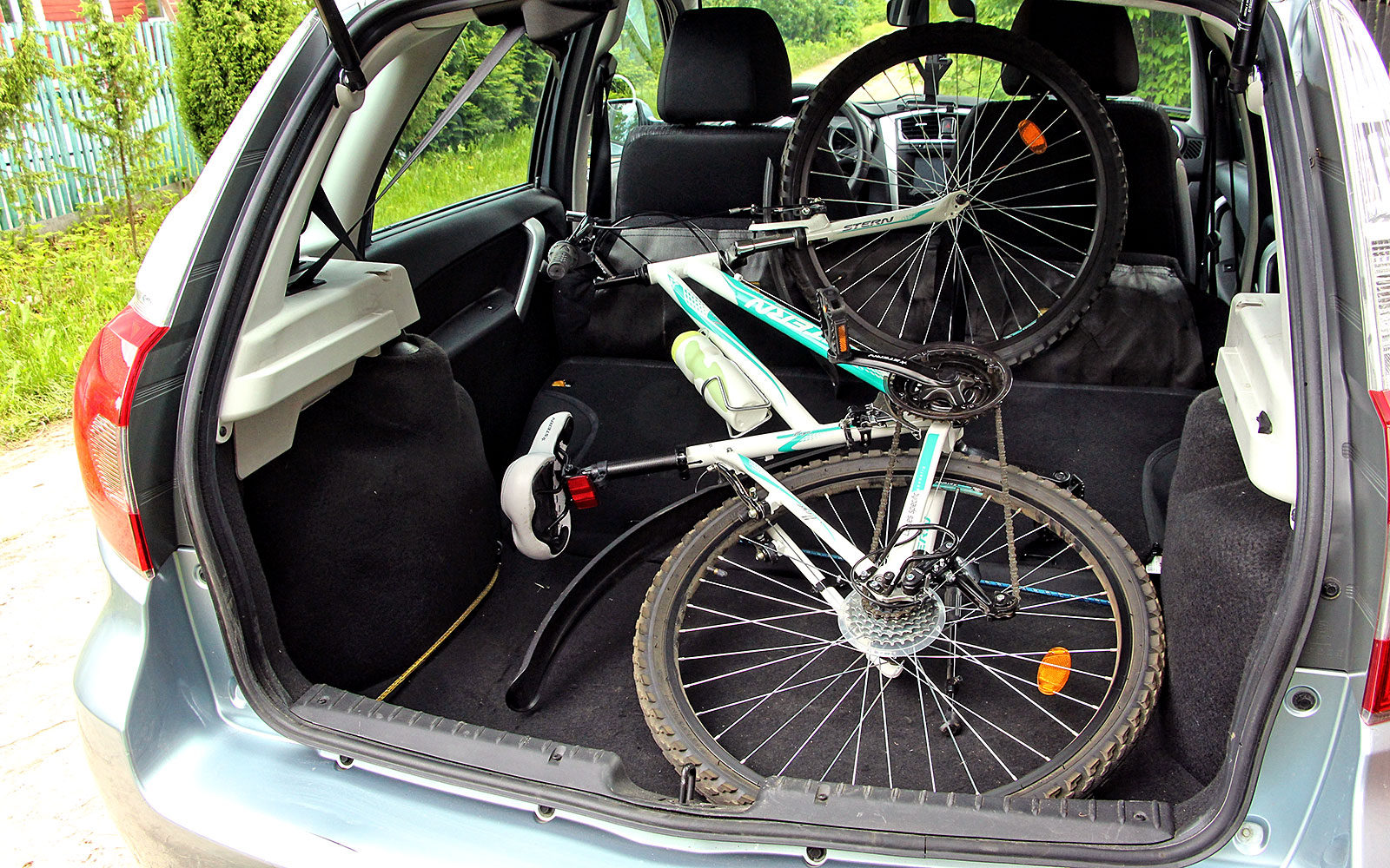 Запихнул я велосипед, и опасения подтвердились — заднее колесо торчало из проема багажника. А откручивать колеса очень не хотелось. Пришлось сдвинуть вперед сиденье переднего пассажира и потом перевести спинку в вертикальное положение. После этого и еще ряда манипуляций байк все же уместился в багажнике. Правда, ценой пассажирских мест — сидеть на переднем сиденье стало почти невозможно, не говоря уже о задних. Зато не пришлось демонтировать переднее колесо велосипеда. Так что перевезти в Датсуне горный байк можно, но стоит помнить, что машина станет одноместной.