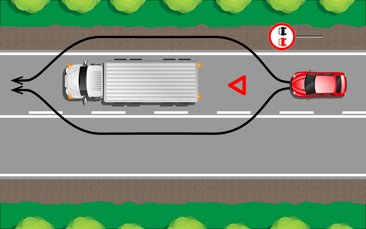 Представьте следующую ситуацию. Вы едете по дороге, которая имеет по одной полосе для движения в каждом направлении, и вдруг видите перед собой сломавшийся грузовик. Обгон на этом участке дороги запрещен знаком. Как же быть?