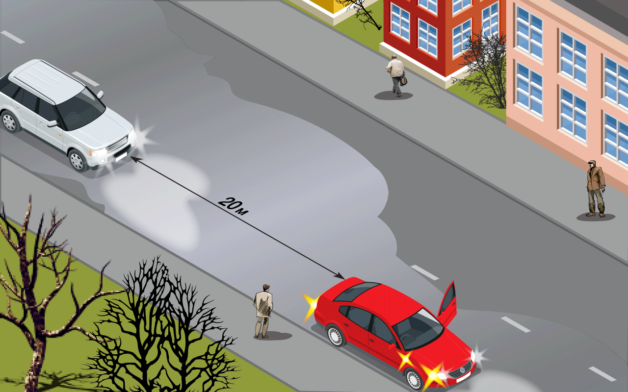 Представьте следующую ситуацию. Вы за рулем легкового автомобиля (на схеме он белого цвета), двигаетесь со скоростью 40 км/ч по городу. Проезжая часть покрыта коркой льда. В 50 метрах перед вами у тротуара останавливается автомобиль (на схеме он красного цвета). Ширина дороги позволяет вам объехать остановившуюся легковушку, не выезжая при этом на встречную полосу. Для этого вы принимаете левее, прижимаясь к разделительной полосе, и продолжаете двигаться в прежнем темпе. Когда до припаркованного автомобиля остается около 20 метров, его водитель неожиданно открывает дверь. Как вы будете действовать?