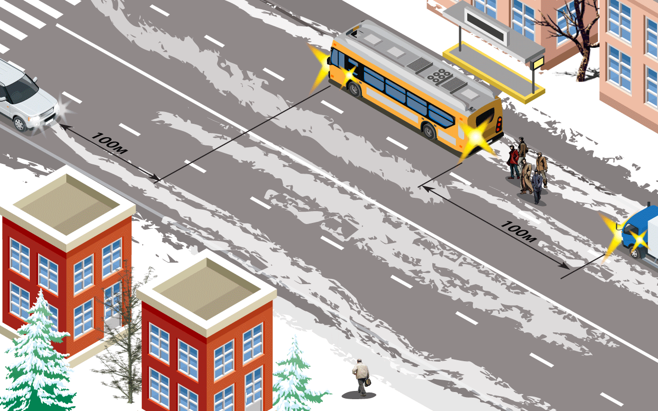 Представьте ситуацию. Вы едете по правому ряду четырехполосной дороги, проходящей через населенный пункт. Спидометр показывает 60 км/ч. На дороге довольно скользко, проезжая часть под слоем мокрого снега. На другой стороне дороги от остановки общественного транспорта, находящейся примерно в 100 метрах от вас, отъезжает автобус, из которого только что вышла компания молодых людей, пребывающих «навеселе». Они по диагонали переходят дорогу, не очень-то обращая внимание на вас и других участников движения. Между тем по правой полосе в двухстах метрах от вашего автомобиля навстречу движется грузовик. Его водитель готовится объехать автобус и перестраивается в соседний ряд.