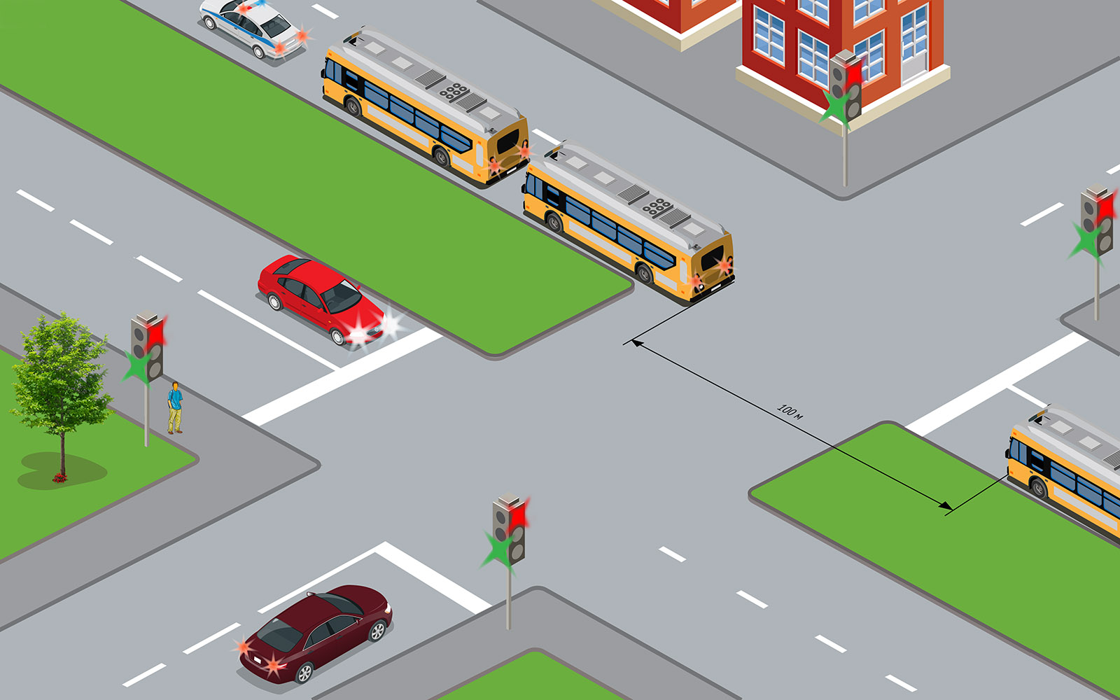 Представим такую ситуацию. В ожидании разрешающего сигнала светофора вы останавливаетесь перед перекрестом с проспектом, транспортные потоки которого разделяет широкий газон. Справа через перекресток следует колонна автобусов, ведомая автомобилем полиции с работающими проблесковыми маячками синего и красного цветов и включенным звуковым сигналом. И вот вам дают зеленый, однако в этот момент вы видите, что к перекрестку приближается еще один отставший от колонны автобус с включенным ближним светом. Не исключено, что и он не последний в колонне. Водители, следующие за вами, не видят отставшего автобуса и уже начинают нервно сигналить вам, мол, «зеленый же. Почему стоим?!» Как вы оцениваете сложившуюся ситуацию и каковы будут ваши действия?