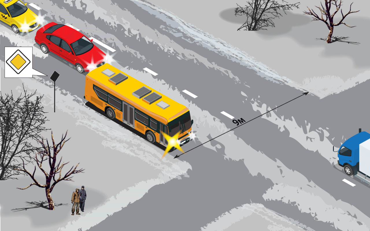 Итак, представьте. Со скоростью 50 км/ч вы приближаетесь к нерегулируемому перекрестку по главной дороге. Проезжая часть шириной около 9 м покрыта талым снегом. Впереди с включенным правым указателем поворота движется автобус. Его водитель принял правее, давая возможность другим водителям опередить его слева, не выезжая при этом на встречную полосу. С противоположной стороны перекрестка навстречу приближается грузовой автомобиль. В это время вы замечаете, что сзади вас поджимает такси, вынуждая прибавить скорость. Есть ли в этой ситуации опасность? Каковы будут ваши действия?