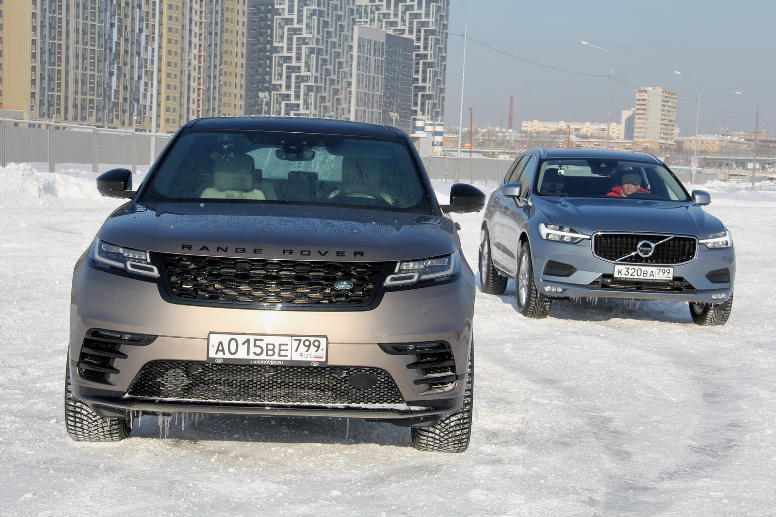 Это был тот самый момент, когда получаешь высший кайф от общения с автомобилем. Парочка Velar и XC60 – просто красавцы, да и погода лучше не придумаешь – минус 10-15, а вокруг белая тишина. Как будто специально расставили декорации для искусственной дуэли, где с одной стороны XC60 – практичный парень, с другой – модник Velar.
