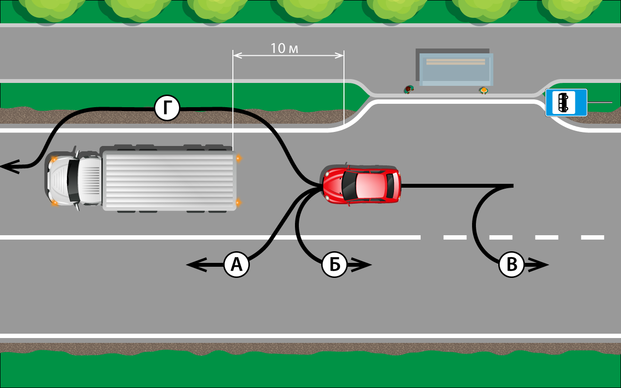 Давайте рассмотрим следующую ситуацию. Вы едете по дороге и видите, что перед вами стоит сломавшийся грузовик. Как поступить в этом случае и по какой из указанных траекторий поехать, чтобы не нарушить ПДД? Отмечайте свой вариант, а правильный ответ — на следующей странице.