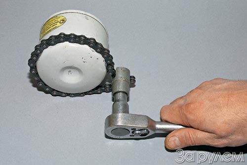 Аналог распространенного и довольно дорогого цепного съемника масляного фильтра нетрудно сделать самому. Берем кусок велосипедной цепи (для фильтров вазовского размера - 30 звеньев) и соединяем его клепкой или штатным замком в кольцо. В старой, поврежденной или просто ненужной торцевой головке "на 19" или "на 22" делаем пропил шириной в цепь. Съемник готов. В присоединительный квадрат головки можно вставлять удлинители любых размеров и ключи-трещотки - это позволит отворачивать фильтры, расположенные в самых труднодоступных местах. А. РЕВИН, МОСКВА