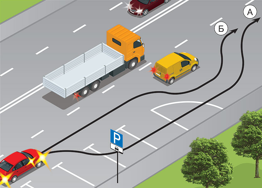По какой траектории водитель красной легковушки может проехать?