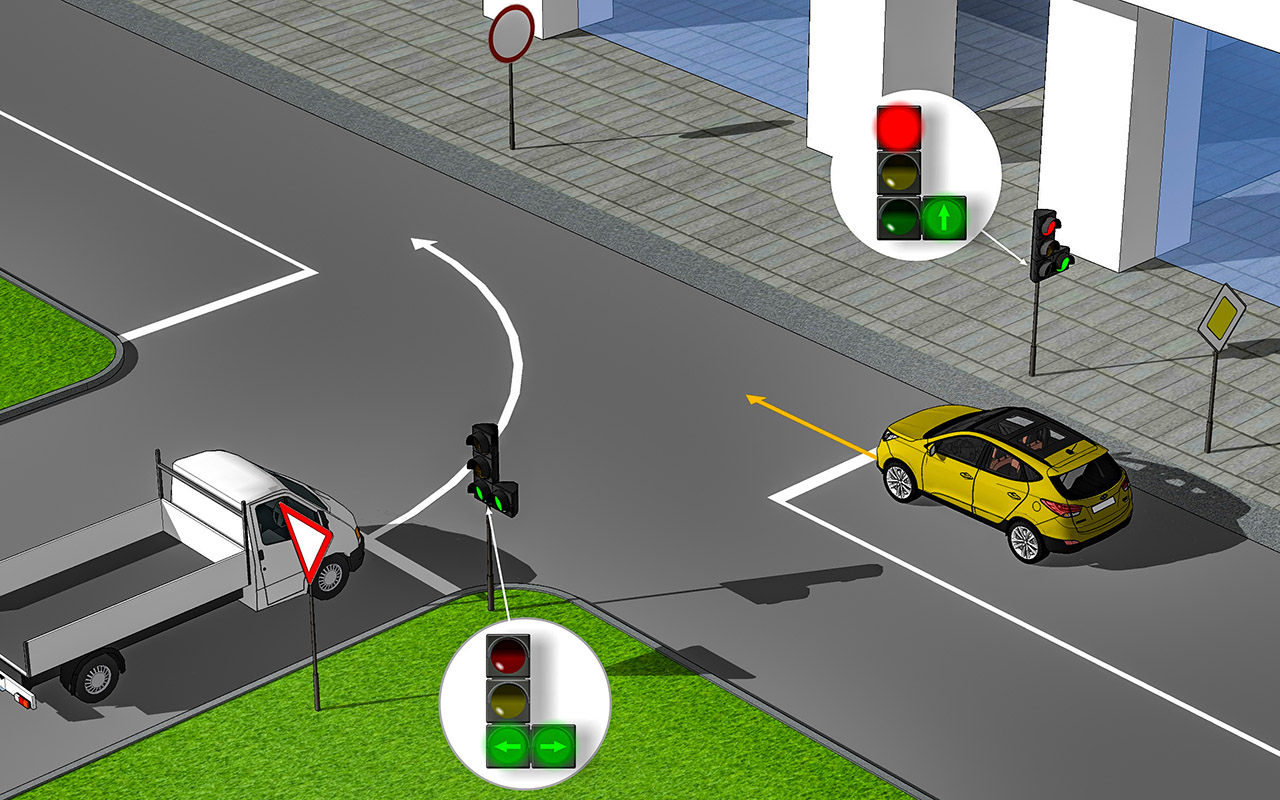 Поскольку светофоры включены, водителям необходимо руководствоваться их сигналами, а не знаками приоритета (пункт 13.2 Правил). Водитель легкового автомобиля движется в направлении стрелки, включенной в дополнительной секции одновременно с красным сигналом светофора, следовательно, должен уступить дорогу грузовику, который едет на основной зеленый сигнал. Нарушение чревато штрафом 1000 рублей по части 2 статьи 12.13 КоАП РФ.