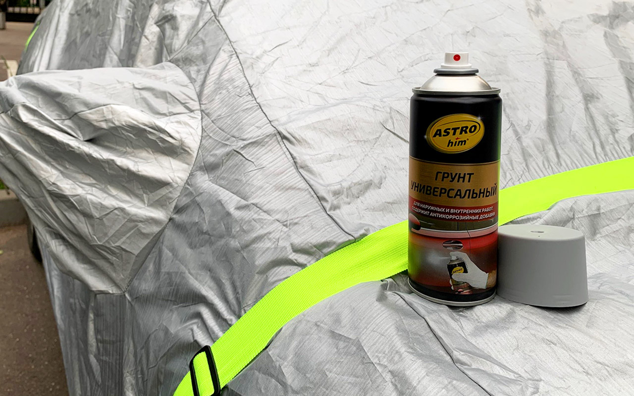 Для начала нужно понять площадь покрытия грунтовки. Если это небольшой фрагмент, то стоит обратить внимание на аэрозольные баллоны с грунтом. Такие предлагает, например, Astrohim в четырех цветах (черный, белый, серый, красно-коричневый). Какой-то под вашу краску ляжет лучше. У грунтовки хорошая адгезия и высокая укрывистость (то есть способность перекрывать цвет поверхности, на которую она нанесена). Одного баллона по идее хватает на одну деталь с покрытием в 2-3 слоя.