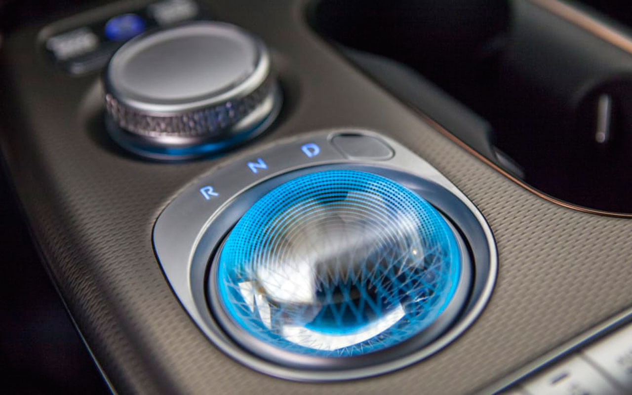Центральным элементом интерьера GV60 стал переключатель Crystal Sphere — стеклянный шар с замысловатым узором и светящийся разными цветами. Поворачиваясь, шар превращается в селектор коробки передач — это указывает на то, что автомобиль «заведен» и можно ехать.