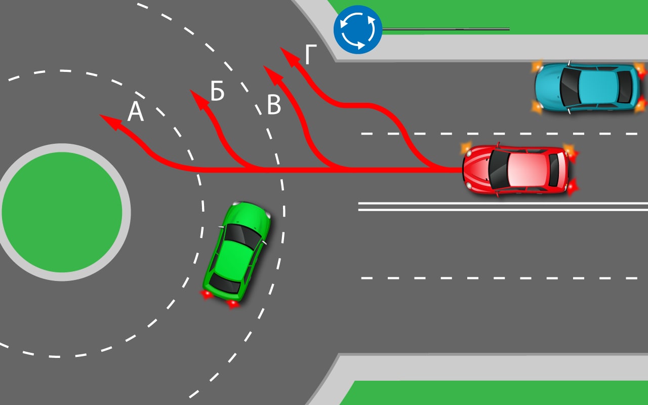 Водитель красного автомобиля подъезжает к круговому перекрестку. Ему нужно проехать прямо. Как ему это сделать, не нарушая ПДД?