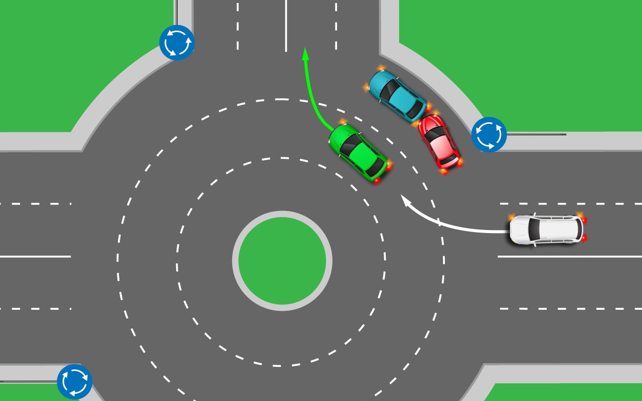 Водитель белого автомобиля выезжает на перекресток с круговым движением. Водитель зеленого собирается с него съезжать. Не нарушают ли они правила?