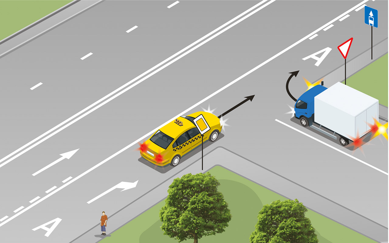 На перекрестке такси двигается прямо по выделенной полосе. А грузовик поворачивает на выделенку. У кого в этой ситуации преимущество?