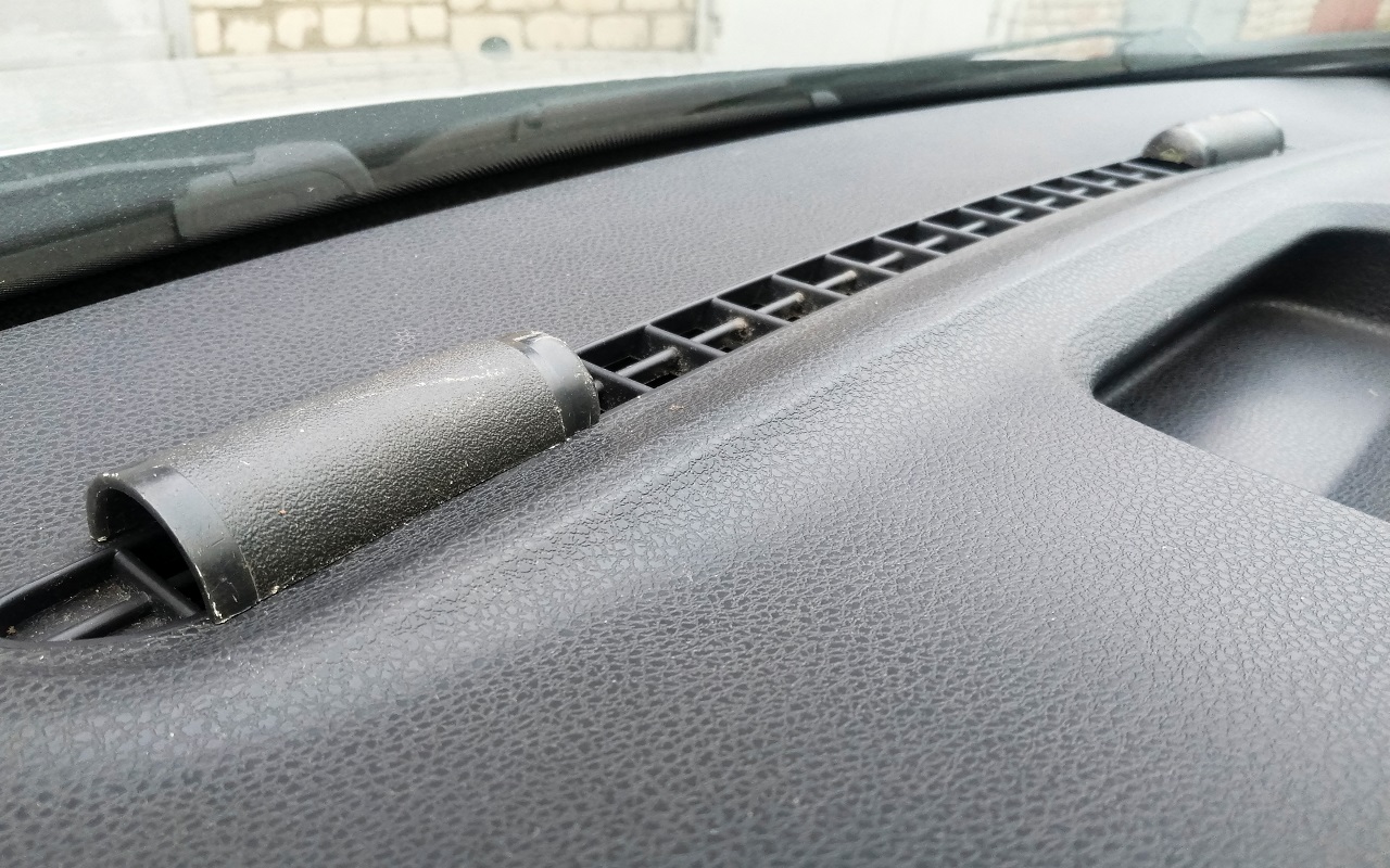 Я изготовил из отрезка трубки два накладных воздуховода на штатную решетку. По размерам и внешне подошла пластиковая ручка от неисправного велонасоса. Диаметр ручки около 35 мм, длина 90 мм. Ручку я распилил вдоль на две части. Термоклеем закрыл оставшиеся небольшие отверстия с одного торца.