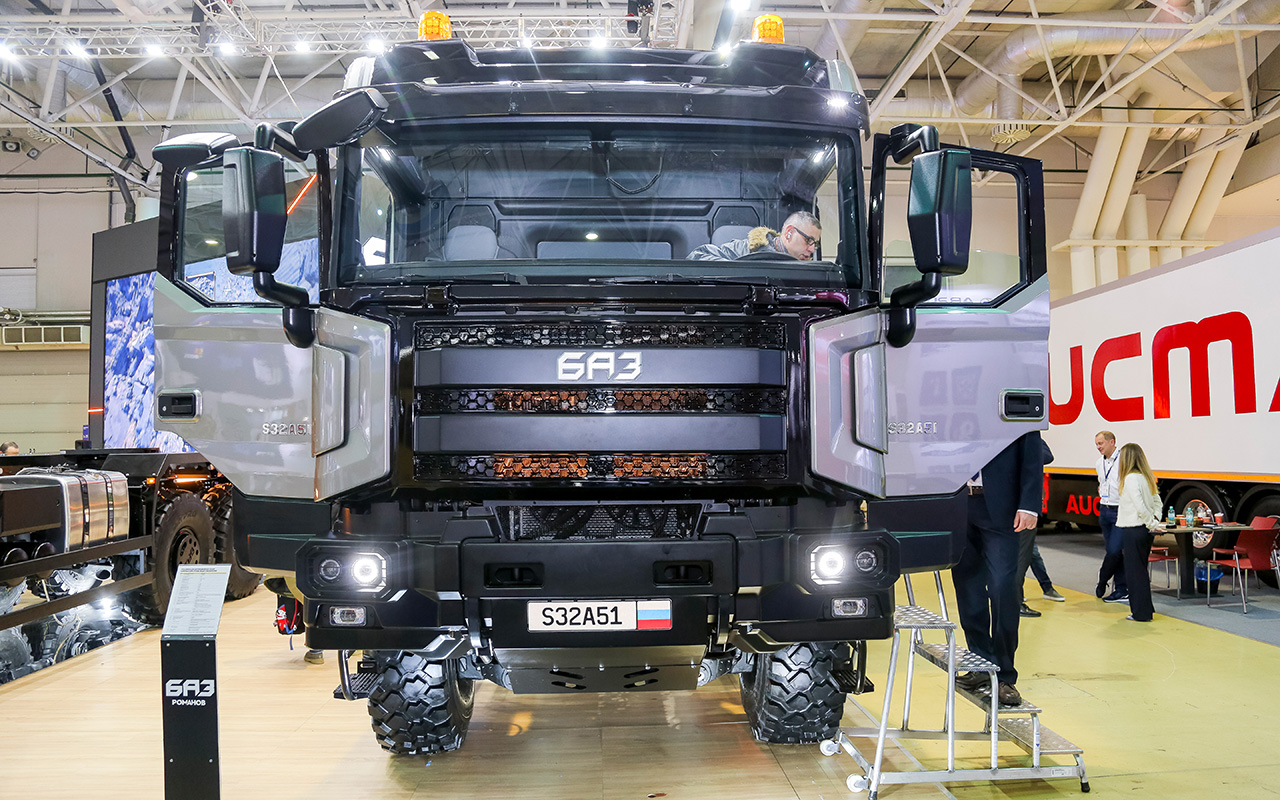 БАЗ – пожалуй, самая интригующая премьера российского комтранса. Бренд расшифровывается как Брянский автомобильный завод, но производство размещено на бывшей площадке по сборке грузовиков MAN под Санкт-Петербургом. В линейку войдут исключительно машины повышенной проходимости. Живьем на выставке показали седельный тягач и самосвал, оба с колесной формулой 6×6.