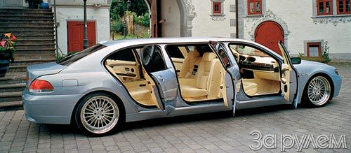Шесть дверей и более шести метров в длину - таков БМВ-745i с кузовом немецкой фирмы "Мутек". В шикарном салоне - два телефона, ультрасовременные CD- и DVD-чейнджеры, спутниковая антенна обеспечивает бесперебойную связь с внешним миром, в том числе через Интернет. Под капотом - баварский мотор, форсированный до 300 кВт/408 л. с.