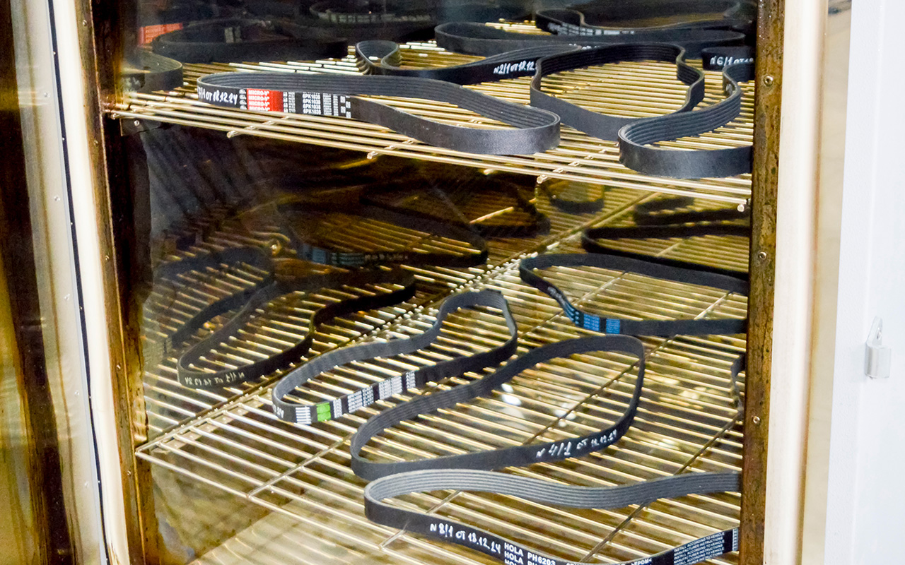 Образцы, не получившие замечаний, размещали в морозильной камере SE30–45‑P для суточной выдержки при температуре –45 °C. После этого ремень выпрямляли в течение пары секунд, не вынимая из камеры. В области перегиба не должно быть разрывов и трещин.