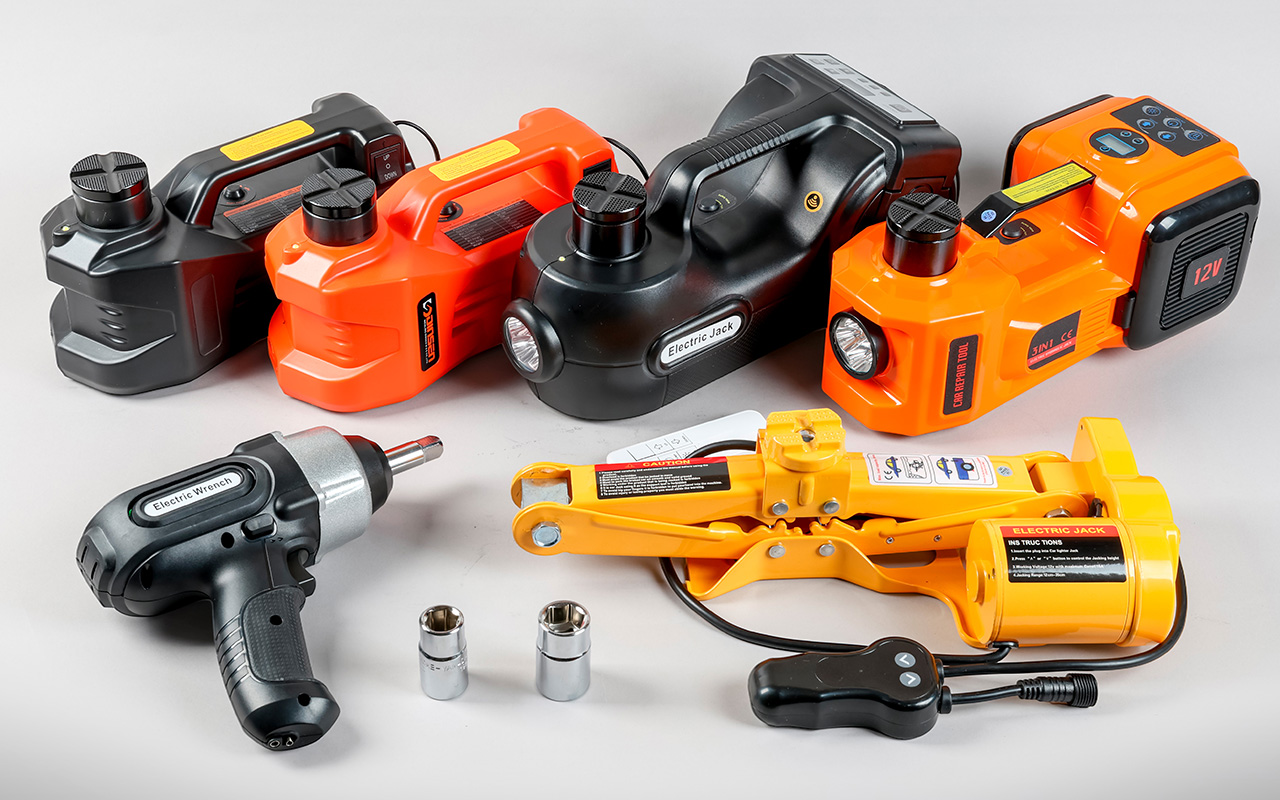 Чтобы выяснить, так ли всё безоблачно, мы приобрели четыре подобных изделия, у которых заявлен подъем автомобиля массой до 3–5 т. Для сравнения взяли и ромбический электромеханический домкрат без гидравлики. Питание у всех – 12 В от бортовой розетки.