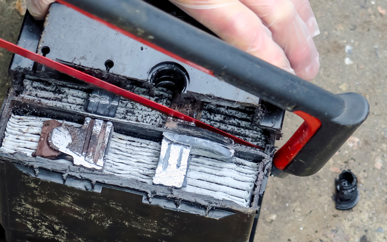 На первый взгляд – в AGM примерно те же пластины, что и в SLI, только цвет половины из них необычно белый. Жидкого электролита не видать. Он абсорбирован стекловолокном, а потому процесс распиливания такой батареи оказался сравнительно чистоплотным: никакая кислота никуда не вылилась.