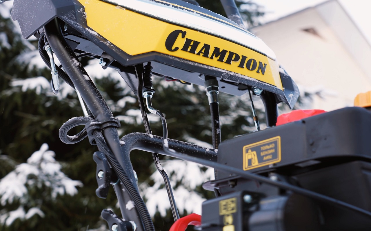Долго сравнивал модели. Основные критерии были: мощность (чтобы много времени не тратить), надёжность запуска в мороз, простота обслуживания. Плюс внешне чтобы выглядел современно. Остановился в итоге на Champion ST 763 E — жёлто-чёрный корпус, спортивный дизайн. Жена сказала, что выглядит больше как недетская (в том числе и по размерам) игрушка, нежели рабочий инструмент.