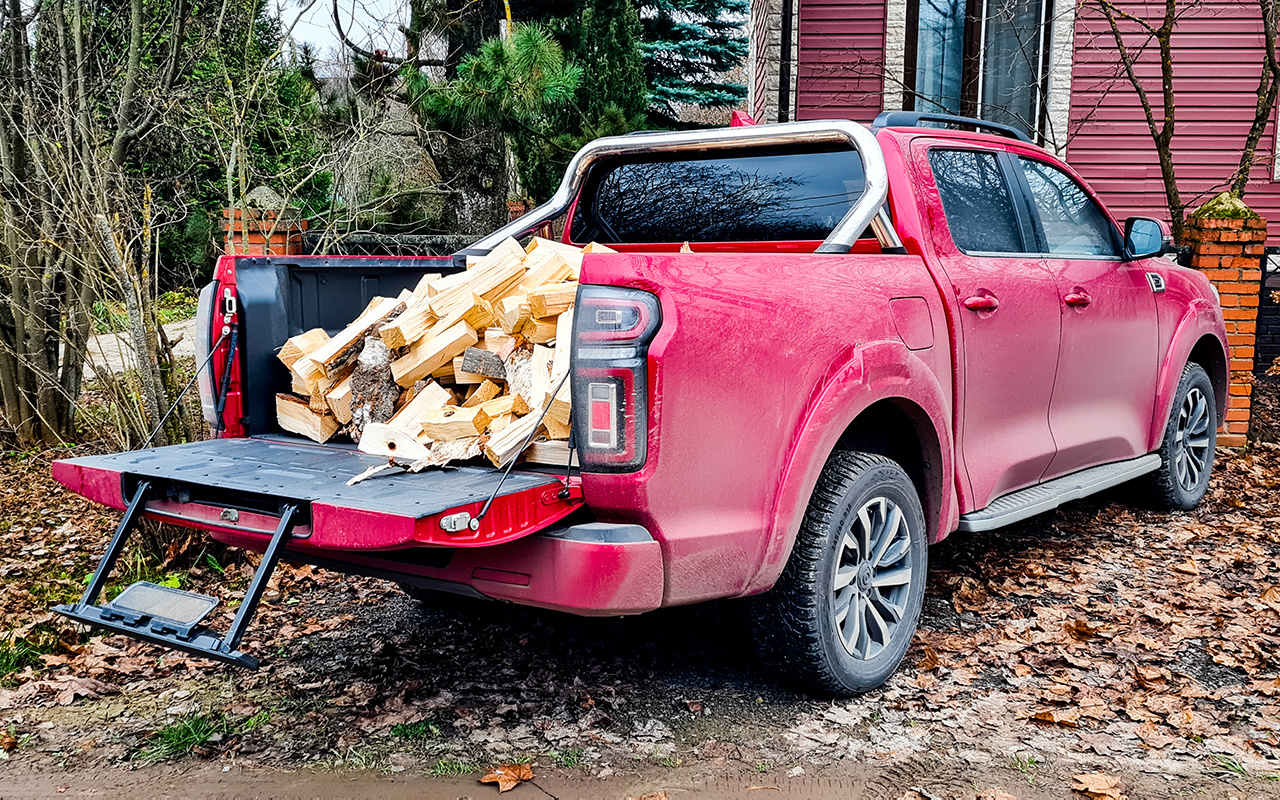 Хорош откидной борт. Его не нужно придерживать, чтобы он не грохнулся – за это отвечают газовые доводчики. А из торца выезжает удобная подножка, что я особенно оценил, когда скакал туда-сюда при разгрузке. Противоударное покрытие кузова отработало как надо: ни одного следа от дров на нем не осталось.