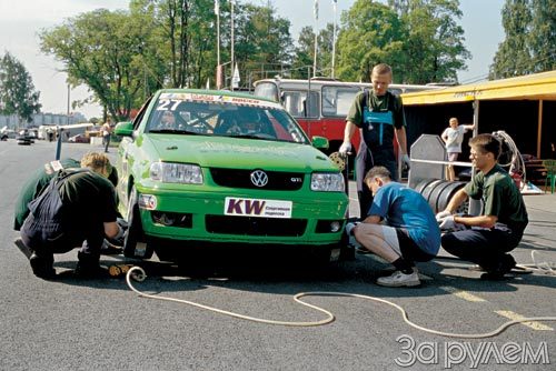 В северную столицу прибыли под вечер и сразу же - за строительство лагеря. Глаза слипались, но руки делали. Рано утром начались тренировочные заезды, и тут же выяснилось, что гонщики - народ капризный. То колодки ему поменяй, то резину, то зеркала отрегулируй. На одном из "Поло" начала вылетать пятая передача. Это - пустяки. Прямо на земле снимаем заднюю крышку. Оказывается, не отрегулирован привод. Пятнадцать минут - и дело в шляпе. У БМВ потек редуктор заднего моста. Копаться с заменой сальника некогда - поменяли узел в сборе. После каждого заезда возимся с настройками, пытаясь выиграть доли секунды. Есть с чем сравнивать - все ходы тщательно занесены в специальные журналы. Потратили целый день, но автомобиль упорно не дотягивал до собственного лучшего времени. Переставили коробку передач - тщетно. Страсти накалились. И хотя буря уже витала в воздухе, команда проявила выдержку. К ночи обнаружили причину - вырвало одну из шпилек крепления стабилизатора поперечной устойчивости. Остальное - дело техники. Правда, толком поспать снова не пришлось.